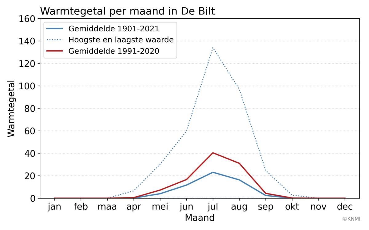 De hoeveelheid warmte in Nederland neemt toe, ook buiten de zomermaanden. Dat blijkt uit een analyse van het zogeheten warmtegetal dat sinds 1901 bijna verviervoudigd is. Dit zomerhalfjaar behoort met 134,6 tot de top 8 van jaren met de hoogste warmtegetallen (bijgewerkt tot 6 september). Als de huidige trend zich voortzet is dit rond 2050 een normale waarde geworden.