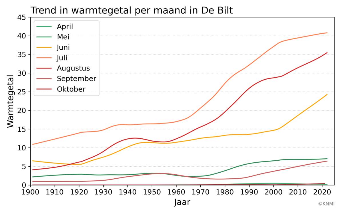 Kijken we naar de trend in warmte per maand, dan zien we dat de hoeveelheid 'warmte' niet alleen toeneemt in de zomermaanden (figuur 3). Zo is het gemiddelde warmtegetal in mei gestegen van ongeveer 3 naar 7 en in september van 1 naar 5. Ook april en oktober beginnen een bijdrage te leveren. Met de verwachte verdere stijging van de gemiddelde temperatuur zal ook het warmtegetal verder toenemen. Als de huidige trend zich voortzet is het relatief hoge warmtegetal van 2022 tot nu toe rond 2050 een ‘normale’ waarde geworden.