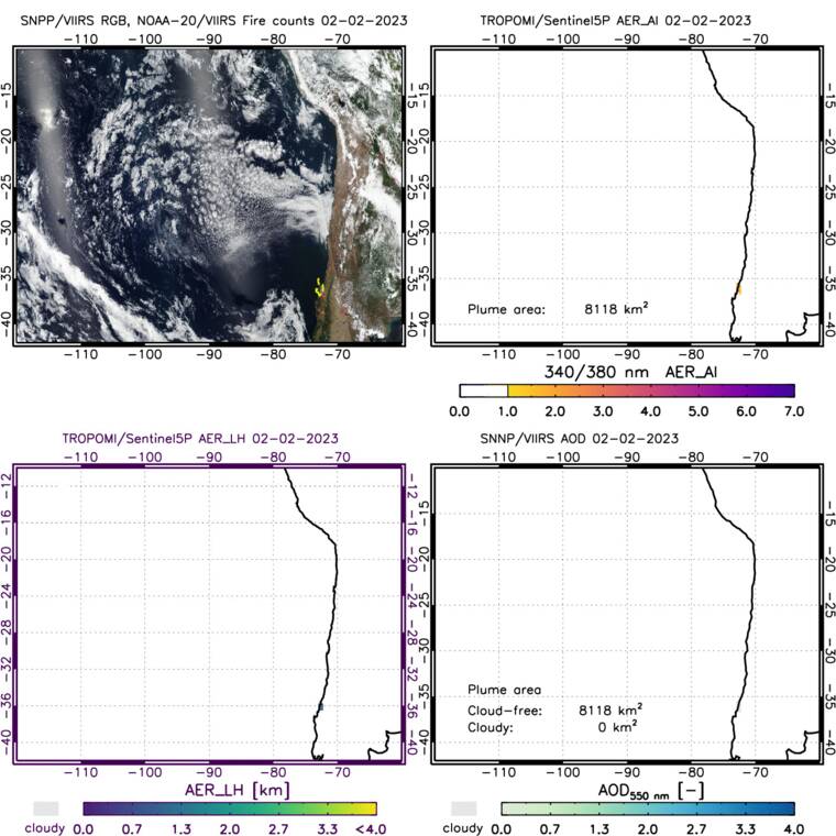 In 2017 en 2023 teisterden grootschalige natuurbranden Chili. De rook van deze natuurbranden bedekten dagenlang een oppervlakte van een paar miljoen vierkante kilometer boven de Stille Oceaan. Plaatje 1 laat zien hoe de rook zich in februari 2023 verspreidde. In dit plaatje hebben we verschillende satellietmetingen gecombineerd en verschillende eigenschappen van de rook afgeleid. Voor beide situaties, 2017 en 2023, hebben we in ons onderzoek de satellietmetingen gecombineerd met berekeningen van waar in de atmosfeer zonlicht wordt opgenomen of weerkaatst. Het doel is om uit te vogelen wat het effect is van de rook op de hoeveelheid opgenomen en weerkaatst zonlicht.