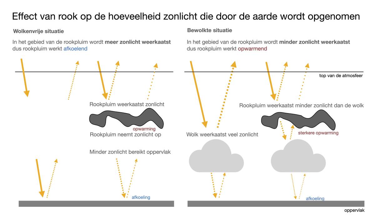 De satelliet ziet meer weerkaatst zonlicht in gebieden met rook in onbewolkte situaties. In die gebieden werkt de rook dus afkoelend op het klimaat. Maar als de rooklaag boven wolken zit, dan ziet de satelliet minder weerkaatst zonlicht, omdat het weerkaatste zonlicht van de wolken door de rooklaag wordt tegengehouden. In de bewolkte gebieden werkt de rooklaag dus opwarmend op het klimaat.