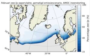 Als door een zwakkere AMOC de wintermaanden kouder worden, zal het zee-ijs zich naar het zuiden uitbreiden. Aangezien zee-ijs, in tegenstelling tot het donkere oceaanoppervlak, veel zonlicht reflecteert, versterkt dat de afkoeling. Volgens deze nieuwe studie kan onder een gematigd emissiescenario (RCP4.5) het zee-ijs in de winter zelfs oprukken tot in de Noordzee, als de AMOC stilvalt (zie afbeelding 1). Daardoor worden onze winters veel kouder (zie afbeelding 2).