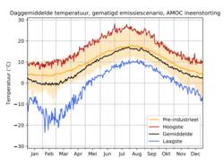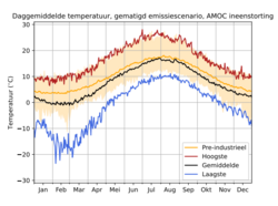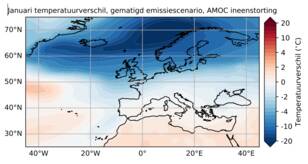 Vooral de minimumtemperaturen maken een flink duikvlucht naar beneden: de eens in de 10 jaar voorkomende koude extremen in de winter kunnen in Nederland zo'n 15 graden lager komen te liggen. De gemiddelde wintertemperatuur zal zo'n 3 graden onder het pre-industriële niveau uitkomen. De temperatuur in de zomer wordt naar verhouding niet heel sterk beïnvloed door het stilvallen van de AMOC (zie afbeelding 3).