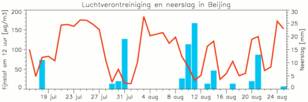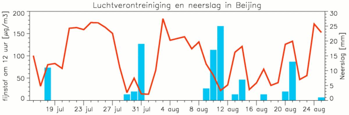 Het viel mee met de smog in Beijing tijdens de Olympische Spelen. De regen heeft ervoor gezorgd dat de concentraties aan fijnstof tijdens de Spelen op geen enkele dag tot extreem hoge waarden, die normaal in droge periodes worden gemeten, konden oplopen. Neerslag is een bepalende factor in de concentratie fijn stof en ozon, omdat het de lucht letterlijk schoonspoelt. De vraag is in hoeverre de luchtkwaliteitsmaatregelen van de lokale overheid ook een rol hebben gespeeld, maar duidelijk is dat de regenbuien een gunstig effect hebben gehad.