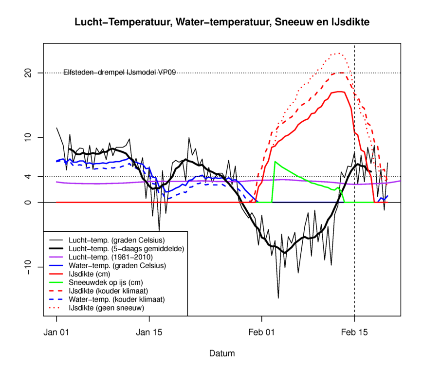 Het lijkt er dus niet zozeer de vorst maar de sneeuw de grootste spelbreker was. In 1997 kon de Elfstedentocht bij vergelijkbare temperaturen maar zonder sneeuw wel plaatsvinden. Gelukkig leverde de koudegolf en het zonnige weer in deze verder zachte winter nog een aantal fraaie schaatsdagen op.