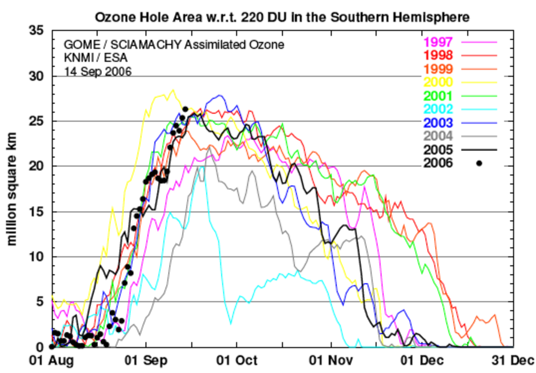 Grootte van het ozongat boven de Zuidpool, in miljoenen vierkante kilometers, voor de afgelopen tien jaar. Gebaseerd op metingen van de satellietinstrumenten GOME (ESA ERS-2 satelliet) en SCIAMACHY (Envisat satelliet). De zwarte bolletjes laten de dagelijkse gegevens zien van 2006, tot halverwege september.