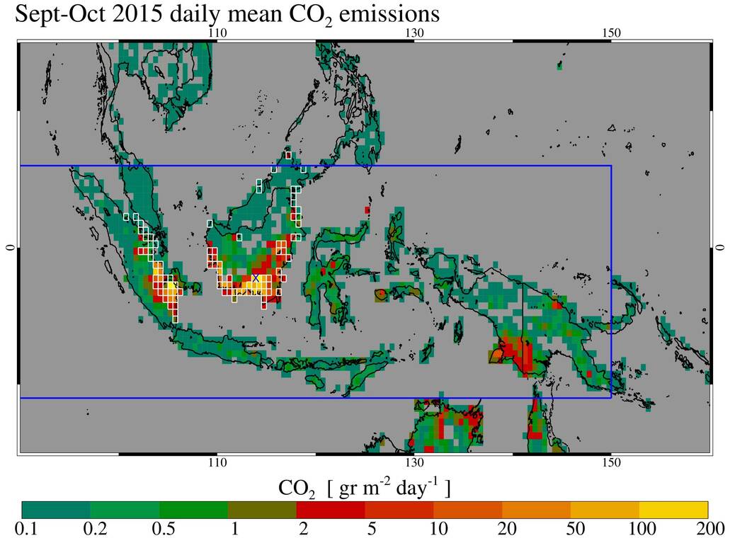De grootte van de CO2-uitstoot is moeilijk vast te stellen met directe CO2-metingen: voor de branden in Indonesië gaat het nog steeds om relatief kleine fluctuaties in CO2 rond een grote gemiddelde waarde, in een uitgestrekt en moeilijk toegankelijk gebied van vele duizenden kilometers. Satellietwaarnemingen van koolmonoxide (CO) laten wel een duidelijk signaal zien, en door een goede afschatting te maken van de lokale verhouding tussen de uitstoot van CO en die van CO2 door de branden kon de grootte van de totale CO2-uitstoot toch goed worden geschat.