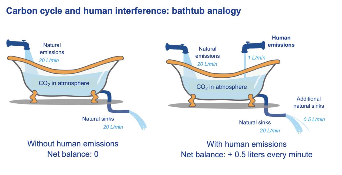 Je kunt het vergelijken met een badkuip. Als er veel water in stroomt, maar evenveel er ook weer uit stroomt dan verandert de hoeveelheid water in het bad niet (afbeelding 2). Maar als je met een gieter water bijgiet, dan neemt het waterpeil toe. Hoe snel hangt af van hoeveel water uit de gieter komt en hoeveel daarvan wegstroomt. Zo werkt het ook met de hoeveelheid CO2 in de lucht.