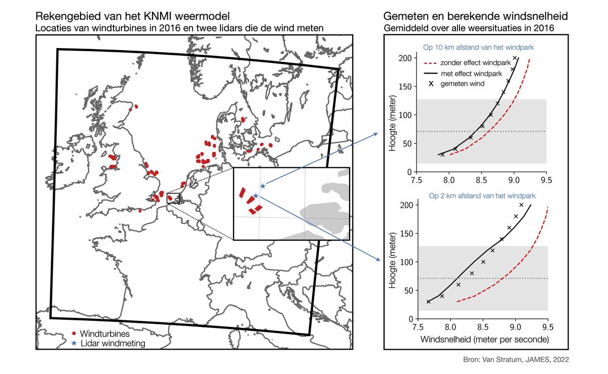 Er komen steeds meer en grotere windparken. Daarom gebruikt het KNMI voor het maken van weersverwachtingen en waarschuwingen sinds afgelopen zomer een versie van weermodel HARMONIE-AROME inclusief het effect van die windparken op de atmosfeer. Met deze versie komt de door het model berekende wind in de omgeving van de windparken beter overeen met de metingen (figuur 1).