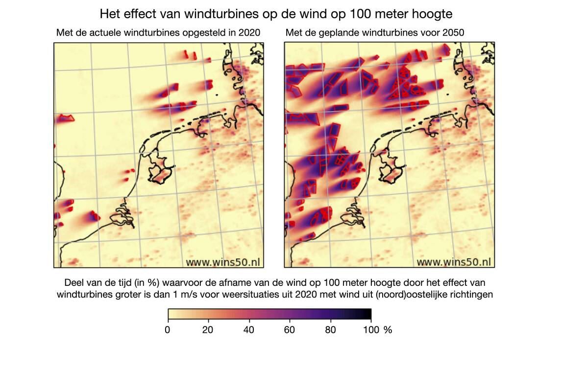 Wat gebeurt er met het weer als we de Noordzee vol zetten met windturbines? Hoeveel groter zijn die zogeffecten als er zoveel windparken bij komen? Is er een maximum aan hoeveel windenergie we op de Noordzee kunnen produceren? Het KNMI heeft dit samen met het bedrijf Whiffle en de TU Delft onderzocht in het WINS50-project. Het blijkt dat windparken in 2050 veel vaker in elkaars windschaduw komen te staan (figuur 3). Om een goede inschatting te kunnen maken van de electriciteitsproductie van windparken op de Noordzee wordt het daarom nog belangrijker dat we begrijpen hoe windparken zich mengen in het weer.