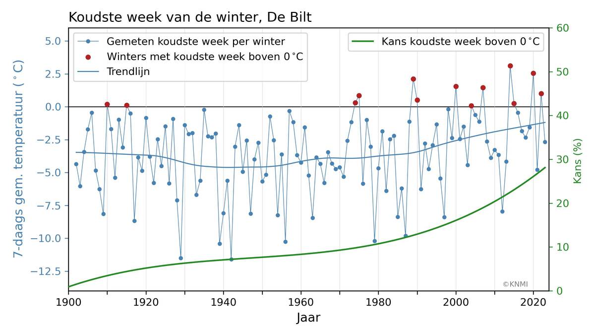 De temperatuurmetingen in De Bilt laten zien dat de koudste week van de winter steeds warmer wordt (figuur 1). Als de koudste week gemiddeld boven nul graden uitkomt, dan ontbreekt in die winter een flinke vorstperiode. Voor 1970 gebeurde dat slechts twee keer, in 1910 en 1915. Na 1970 kwam dat al elf keer voor, met als uitschieter voorlopig de winter van 2014 met een koudste week van 3,1 graden. De kans dat in een winter de koudste week boven nul graden blijft, neemt dan ook snel toe (groene lijn in figuur 1). Was de kans voor 1980 nog kleiner dan 10 procent, inmiddels is die kans opgelopen tot 30 procent.
