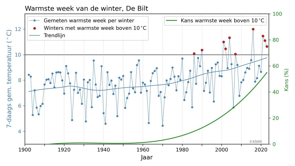 Met het verdwijnen van de strenge winterkou, doen zachte lentetemperaturen hun intrede in de winter. Als we kijken naar de warmste week van de winter, zien we dat deze steeds vaker boven de 10 graden uitkomt (figuur 2). De warmste week in de huidige winter was tot nu toe de week van 31 december tot en met 6 januari met een gemiddelde temperatuur van 10,6 graden. De eerste keer dat de warmste winterweek boven de 10 graden uitkwam was in 1986. Inmiddels is dat al tien keer voorgekomen. Met een kans van 50 procent is een dergelijke warme week al heel gewoon geworden (groene lijn in figuur 2).