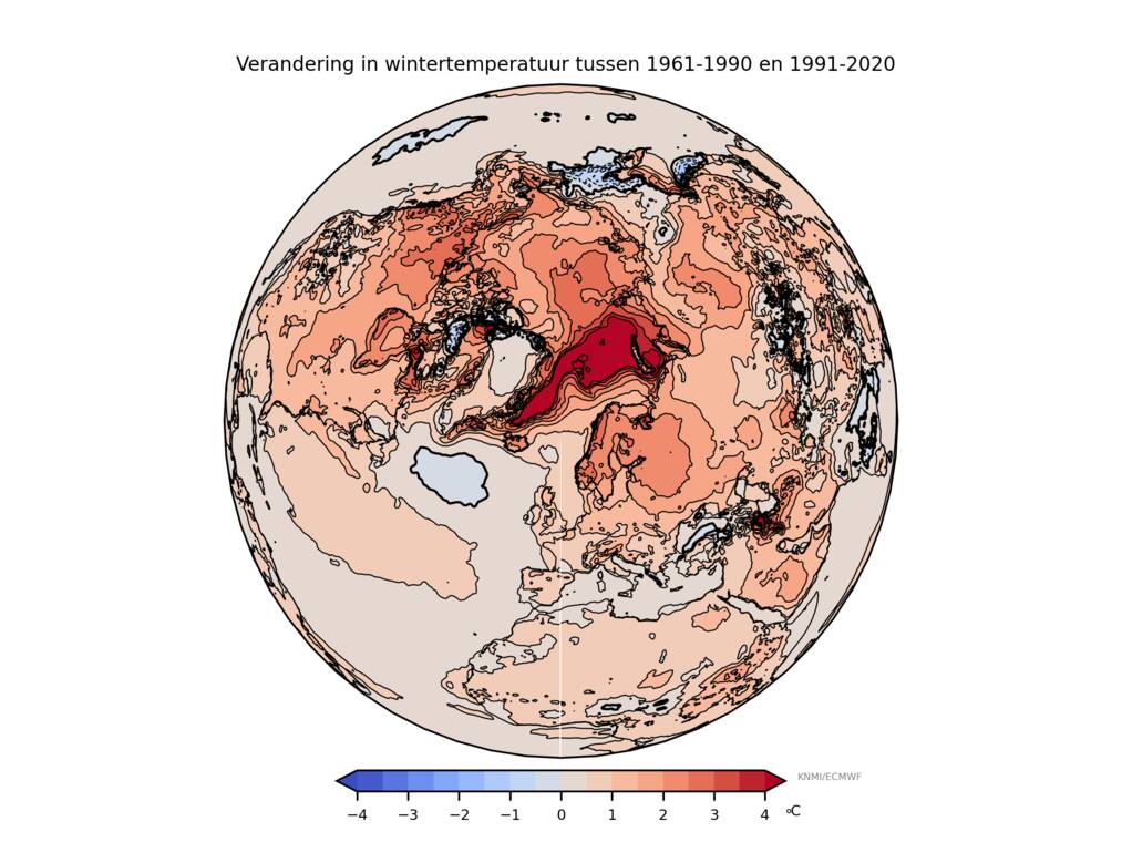 Als we de periode 1961-1990 vergelijken met 1991-2020 dan is de warmste week 0,9 graden opgewarmd en de koudste 1,6 graden, bijna twee keer zo veel. De oorzaak is dat de gebieden waar onze kou vandaan komt, Scandinavië en Siberië, sneller opwarmen dan de gebieden waar onze winterwarmte vandaan komt (zuidwesten). De winters in Scandinavië zijn meer dan twee graden opgewarmd, de oceaan ten zuidwesten van ons minder dan een halve graad (figuur 3). De opwarming van de aarde zet door, waardoor de echte winterkou rap uit ons land verdwijnt.