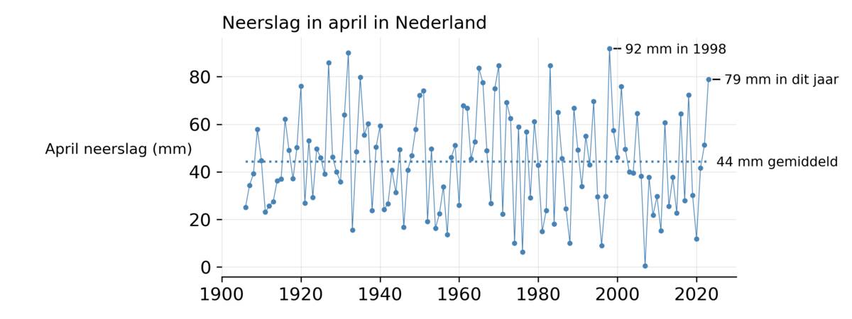 In april viel er minder regen dan in maart, 79 millimeter (figuur 2). Maar dat is veel meer dan er gemiddeld valt in april (44 millimeter). Ook in april zijn de variaties van jaar op jaar groot. Zo regende het in april 2007 niet of nauwelijks, maar viel er 92 millimeter in 1998, de hoogste waarde van de meetreeks.