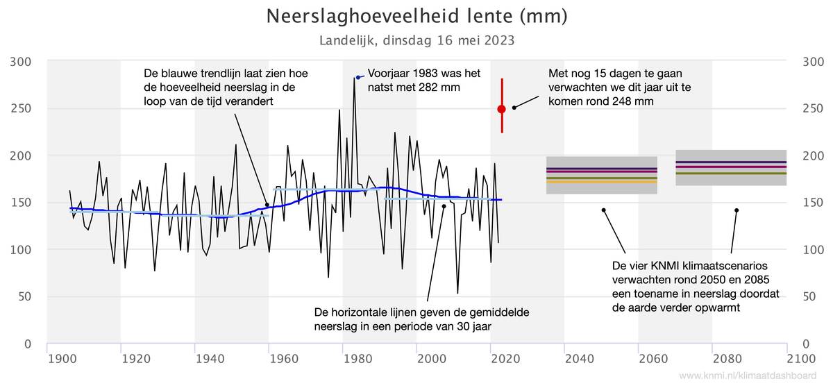 Ook in mei is al de nodige regen gevallen. De maand is nog niet voorbij, maar op het klimaatdashboard is te zien dat deze lente volgens de verwachting tot de natste lentes van de hele meetreeks gaat behoren (figuur 3). Met 248 millimeter steekt alleen de extreem natte lente van 1983 erbovenuit met 282 millimeter.