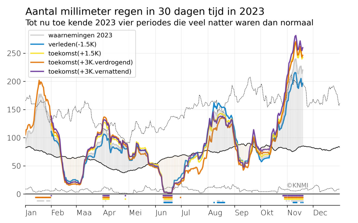 Met regionale weer- en klimaatmodellen kunnen we het weer van vandaag als het ware vertalen naar een koeler of warmer klimaat. We hebben dit gedaan voor het weer van 2023 tot nu toe. In plaatje 3 kun je zien hoeveel regen het weer van dit jaar volgens deze berekeningen gebracht zou hebben in een koeler én in een warmer klimaat. Je ziet aan de gekleurde lijnen van de warmere klimaten dat het woeste herfstweertype van de recente weken in een warmer klimaat meer regen geeft. In een koeler klimaat (blauwe lijn) zou het minder geregend hebben, maar nog steeds zou het uitzonderlijk nat zijn geweest. De duur van het natte weertype en tegelijkertijd de hoge temperatuur van het oceaanwater zijn daarvan de oorzaak.