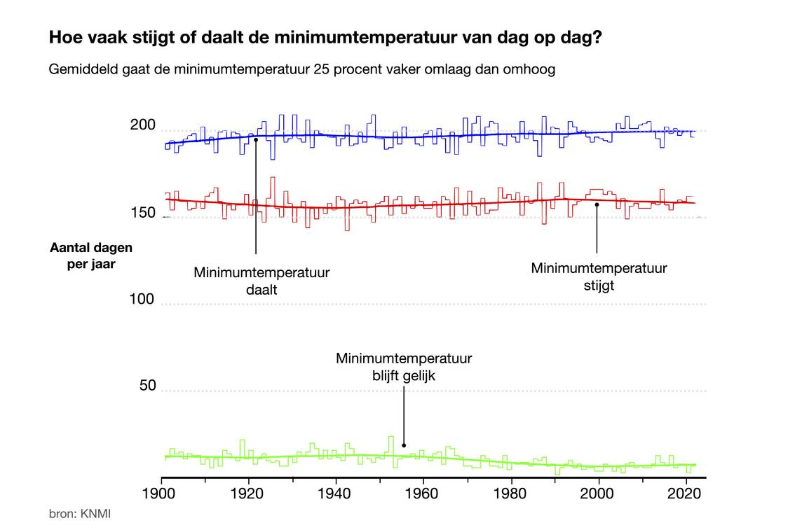 Dit alles betekent niet dat de minimumtemperatuur steeds lager wordt. De dalingen komen wel vaker voor, maar ze zijn ook kleiner dan de temperatuurstijgingen. In een stabiel klimaat houden stijgingen en dalingen elkaar precies in evenwicht. Dat geldt ook voor de maximumtemperatuur, alleen stijgt die vaker en met een kleinere stap dan dat die daalt. Door klimaatverandering zien we beide temperaturen geleidelijk stijgen.