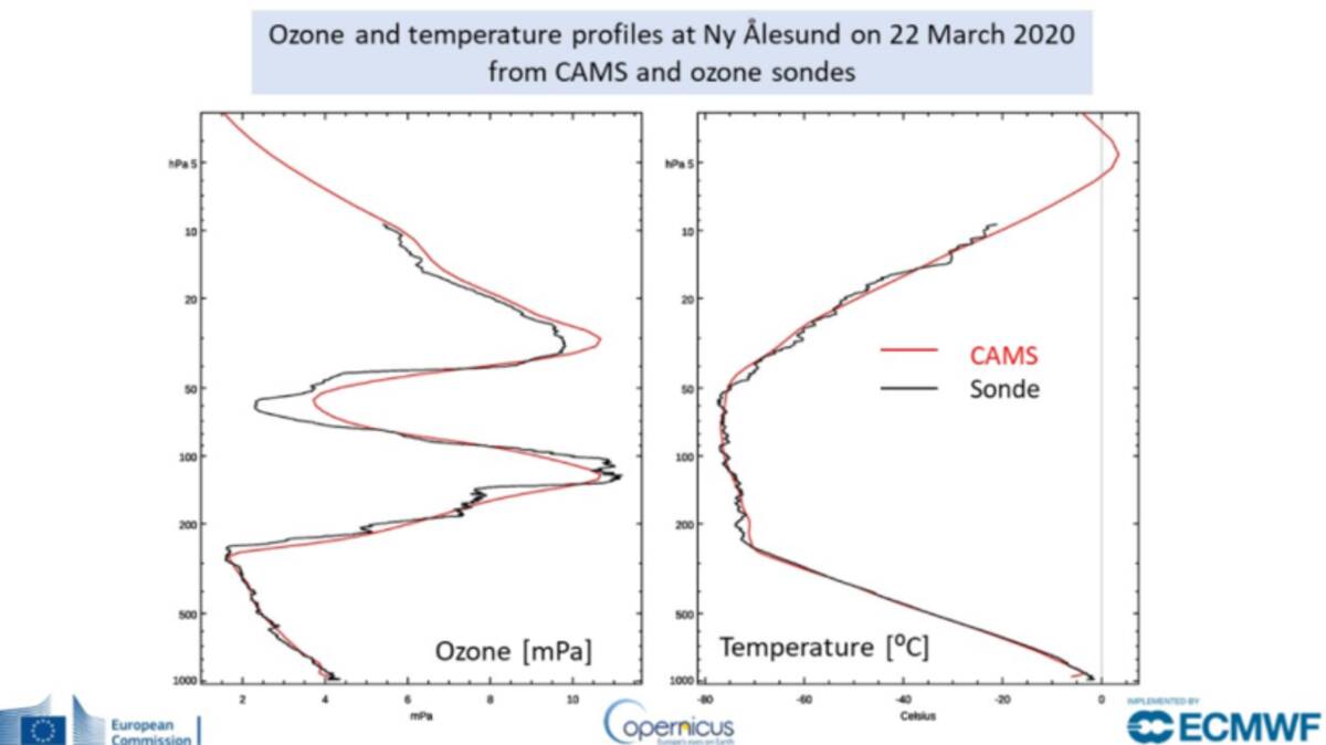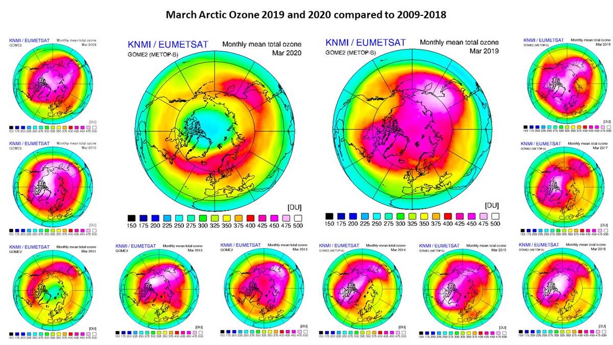 Het proces van ozonafbraak onder invloed van het eerste zonlicht na de poolwinter is een bekend fenomeen boven de Zuidpool. Elk voorjaar, in september, ontstaat daar een groot en stabiel ozongat. In de maanden daarop vult het ozongat weer op door inmenging van ozonrijke lucht uit het noorden. Een soortgelijk ozongat in het voorjaar boven de Noordpool is zeldzaam, maar de huidige ozonafbraak boven de Noordpool is sterker dan ooit is waargenomen (figuur 2). De oorzaak van het huidige ozongat is een zeldzaam aanhoudend sterke poolwervel (polaire vortex), waardoor de temperaturen binnen de poolwervel langdurig extreem laag zijn gebleven, vooral op een hoogte van ruim 20 kilometer (oftewel een druk van 50 hectoPascal, zie figuur 3). Inmiddels warmen de koudste lagen langzaam weer op.