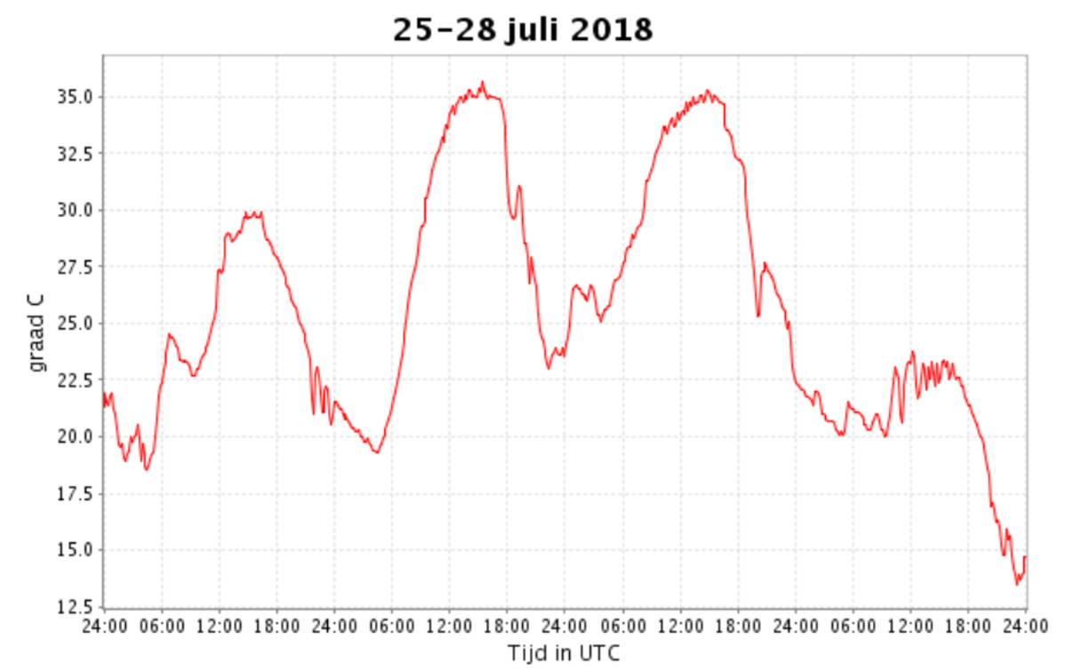 De hittegolf bracht vorige week twee bijzonder warme nachten. In grote delen van het land waren het tropische nachten met temperaturen boven de 20 ºC. In De Bilt werd het in de nacht naar vrijdag 27 juli zelfs niet koeler dan 23,0 ºC. De minimumtemperatuur wordt echter tussen 0 UTC en 24 UTC bepaald, dat is twee uur 's nachts in Nederland. Voor een hoge minimumtemperatuur in de reeks zijn dus twee warme nachten nodig. Hierdoor kwam de officiële minimumtemperatuur op 22,4 ºC uit, de temperatuur om 2 uur 's nachts op zaterdag 28 juli.