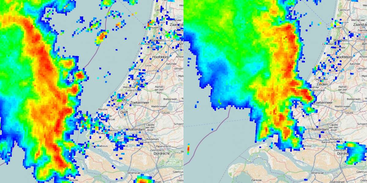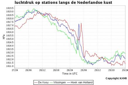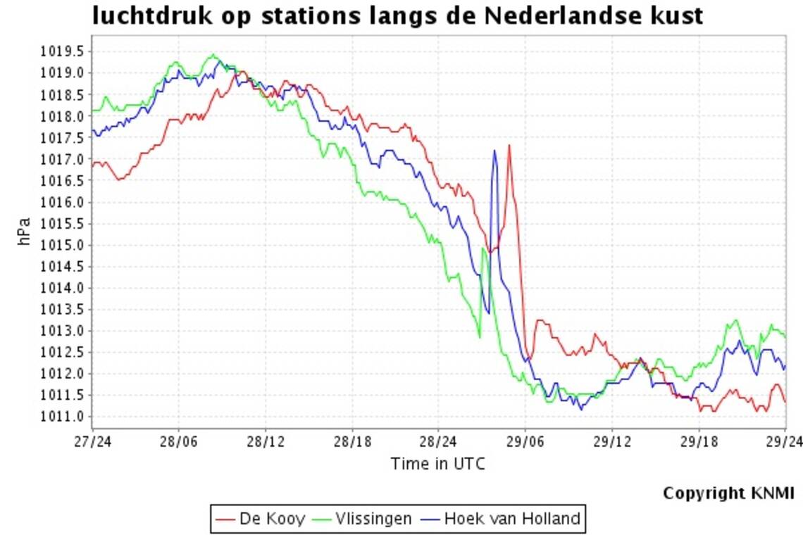 De buien bereikten in de vroege ochtend het zuidwestelijk kustgebied van Nederland. Op dat moment was er sprake van een scherp begrensde buienlijn, de zogenoemde ‘squall line’, die met een snelheid van circa 75 kilometer per uur parallel aan de kust naar het noorden trok. Onder de buienlijn ontwikkelde zich een luchtdrukverstoring die in de metingen op KNMI-stations goed zichtbaar was. Op sommige plaatsen was de 'onweersneus' ruim 5 hPa.