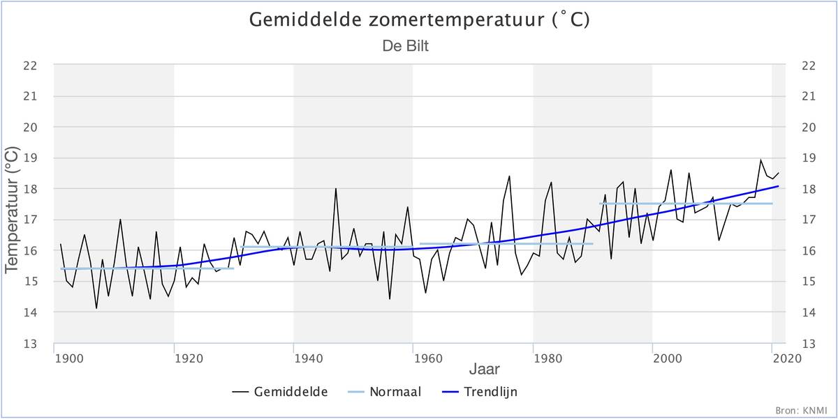 De week met gemiddeld de warmste nachten van het jaar is sinds 1901 met zo'n 2,5 °C warmer geworden