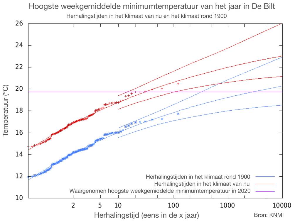 De minimumtemperatuur schommelde in de week van 9 tot en met 15 augustus 2020 tussen de 18,4 en 21,5 graden. De weekgemiddelde minimumtemperatuur kwam uit 19,7 graden. Een dergelijke hoge weekgemiddelde minimumtemperatuur is niet eerder voorgekomen sinds tenminste 1901 (figuur 2). Ook is in de afgelopen eeuw een opwaartse trend te zien is. De week met gemiddeld de warmste nachten van het jaar is sinds 1901 met zo'n 2,5 graden warmer geworden.