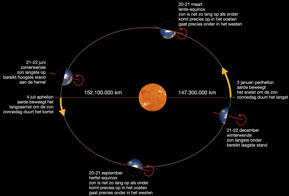 De precieze baan van de aarde rond de zon is heel bepalend voor de hoeveelheid zonlicht die op het aardoppervlak valt. Omdat het weer sterk beïnvloed wordt door de hoeveelheid zonlicht, wordt de positie van de aarde ten opzichte van de zon heel nauwkeurig berekend in onze weer- en klimaatmodellen. De langste nacht, of kortste dag, luidt het begin van de astronomische winter in. De datum varieert van jaar tot jaar tussen 21 en 22 december. De scheve stand van de aardas draait het noordelijk halfrond van de zon af in onze winter waardoor wij in Nederland het minste licht ontvangen op 21 december. Dit moment wordt ook wel de winterzonnewende genoemd, het moment waarop de zon de zuidelijkste positie bereikt gezien vanaf de aarde, waardoor de zon voor ons het laagst aan de hemel staat (Figuur 1).
