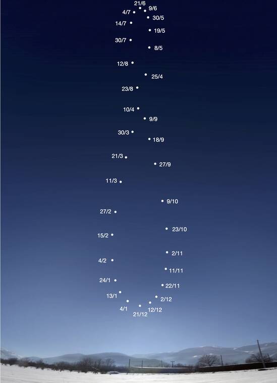 De winterwende is echter niet het moment waarop de zonsondergang ook het vroegst is of de zonsopkomst het laatst. Dit komt omdat de baan van de aarde om de zon niet perfect rond is, maar ellipsvormig. De aarde beweegt sneller wanneer deze dichter in de buurt van de zon is, tijdens onze winter (Figuur 1). Door deze winterse versnelling in de baan om de zon, moet de aarde elke dag een stukje verder om zijn as draaien om de zon weer op dezelfde locatie boven zich te krijgen. Hierdoor komt de zon rond 21 december elke dag iets minder dan een halve minuut later op en gaat iets meer dan een halve minuut later onder. Gevolg is dat de laatste zonsopgang negen dagen later valt, namelijk op 30 december. Andersom valt de vroegste zonsondergang hierdoor juist eerder dan de winterwende, dit jaar op 12 december (Figuur 2). Een samengestelde foto van de zon om 12 uur genomen op een aantal dagen in het jaar laat zien hoe de zonnetijd door het jaar heen afwijkt van de kloktijd (Figuur 3).
