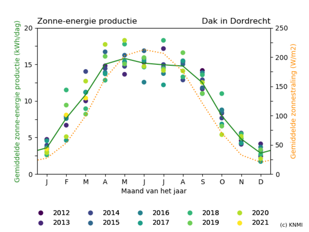 Een belangrijk tweede aspect bij zonne-energie productie is het feit dat zonnepanelen beter werken, efficiënter, bij lage temperaturen. Die zonnige dagen in juli en augustus zijn dus vaak te warm voor de optimale werking van zonnepanelen.
