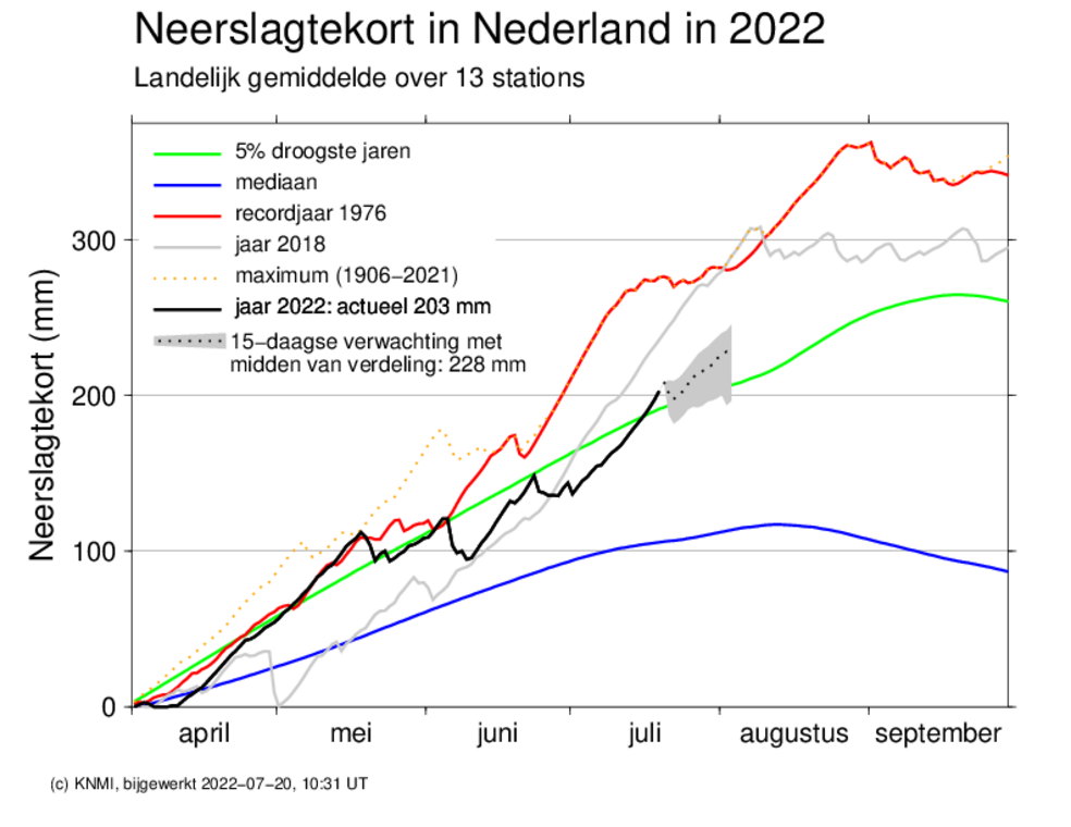 Even leek het erop dat de voorjaarsdroogte door de relatief natte juni getemperd werd. Maar nu er in juli nog maar amper regen is gevallen, is het onderwerp droogte weer ‘hot’ geworden. Het neerslagtekort sinds 1 april van dit jaar hoort weer bij de 5% droogste jaren (figuur 1). Gezien vanaf 1906 zijn er slechts 5 jaren die op 18 juli droger waren. Dit past goed bij het beeld dat een voorjaar met een groot neerslagtekort een grotere kans geeft op een extremer neerslagtekort later in het jaar. Ook elders in Europa is het extreem droog.