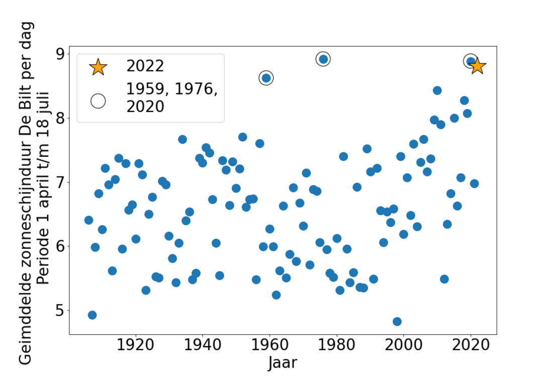 Inderdaad blijkt dat de verdamping in De Bilt tussen 1 april en 18 juli extreem hoog is. Waarom is dat het geval? Een antwoord hierop is te vinden door te kijken naar welke weersinvloeden bijdragen aan de verdamping. Dat zijn: 1) de hoeveelheid zonnestraling; en 2) de temperatuur. Hoe warmer en hoe meer zonnestraling, hoe meer er verdampt. De gemiddelde temperatuur vanaf 1 april was tot nu toe niet extreem. Wat zon betreft is dit een heel ander verhaal. Dit wordt duidelijk als we kijken naar het aantal zonuren, dat sterk samenhangt met de hoeveelheid zonnestraling. Wat blijkt: slechts twee keer eerder hadden we per dag gemiddeld zoveel zonuren als nu (figuur 2). Kortom, het is de zon die tot nu toe het verschil maakte.