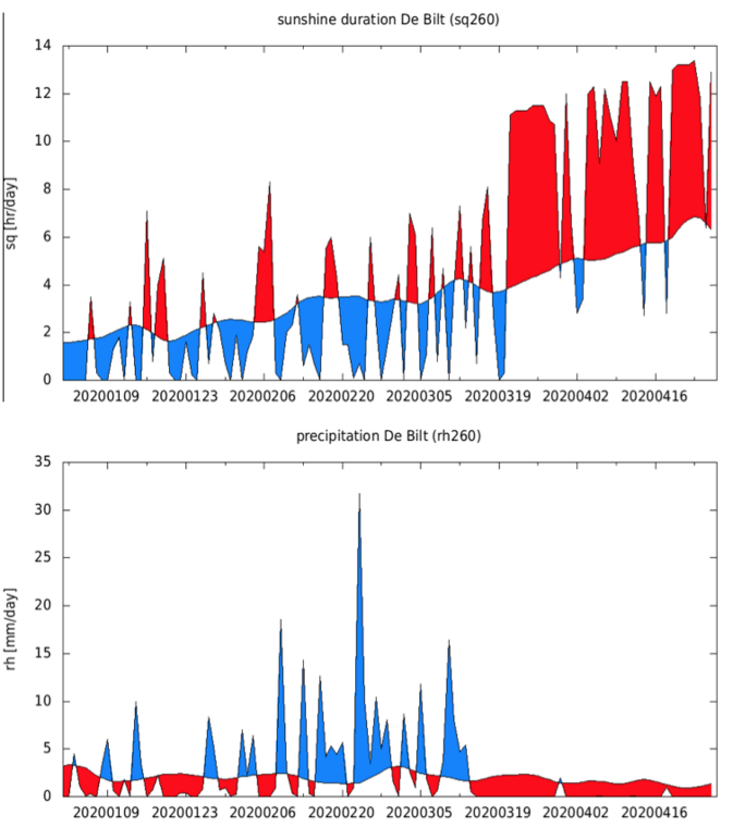 In januari, februari en begin maart hadden we door de aanhoudende westenwind veel bewolking en weinig zon (figuur 1). Vanaf 21 maart sloeg het weer echter om en werd op veel dagen meer dan 90 procent van het maximale aantal uren zonneschijn—van zonsopkomst tot zonsondergang—genoteerd.
