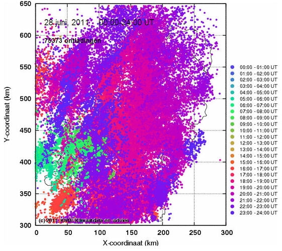 De zware onweersbuien die dinsdagavond en in de nacht naar woensdag vanuit België over Nederland zijn getrokken, kenmerkten zich vooral door het grote aantal bliksemontladingen. Het gecombineerde Belgisch-Nederlandse bliksemmeetnet heeft circa 75.000 ontladingen geregistreerd tot 02.00 uur ’s nachts. Dit is bijzonder hoog maar geen record. Zo zijn er op 17 juli 2004 zo’n 80.000 ontladingen geregistreerd.