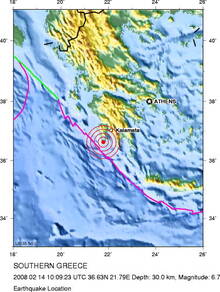 Op donderdag 14 februari om 10:09 UT (11:09 NL-tijd) heeft een zware aardbeving bij Griekenland plaatsgevonden. De lokatie van de beving was uit de kust, circa 50 kilometer ten zuiden van de Peloponnesos.
