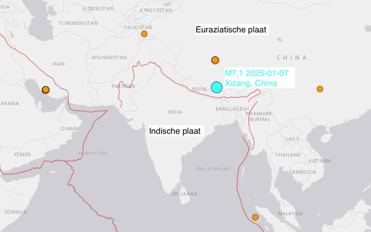 In China is er om 02:05 uur Nederlandse tijd (09:05 uur lokale tijd) een aardbeving met een magnitude van 7,1 opgetreden. Deze beving vond plaats in Tibet, in het zuiden van China op een diepte van 10 kilometer. Het gebied bevindt zich op de grens van twee tektonische platen, de Euraziatische en Indische plaat.