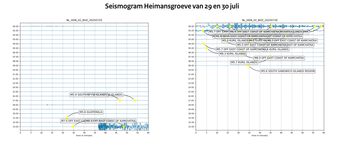 De zware aardbeving bij Kamtsjatka is ook in Nederland gemeten. De beving was hier niet voelbaar, maar de gevoelige meetapparatuur van het KNMI registreert wél het seismische signaal. De bodembeweging is live te volgen via onze seismische stations. Er zit ongeveer 12 minuten vertraging tussen het moment van de beving en het signaal dat in Nederland aankomt.