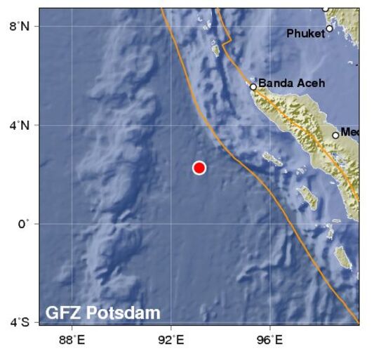 De locatie is ongeveer 500 km voor de westkust van Atjeh, Noord-Sumatra.Dat is 300 km ten westen van de grote beving van 26 december 2004.