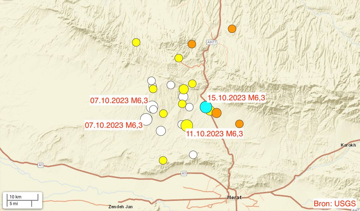 Afghanistan is sinds zaterdag 7 oktober getroffen door vier zware bevingen met een magnitude van 6,3. De bevingen vonden allemaal plaats nabij de op een na grootste plaats van Afghanistan, Herāt. Vier zware bevingen in dezelfde regio met eenzelfde magnitude is uniek.