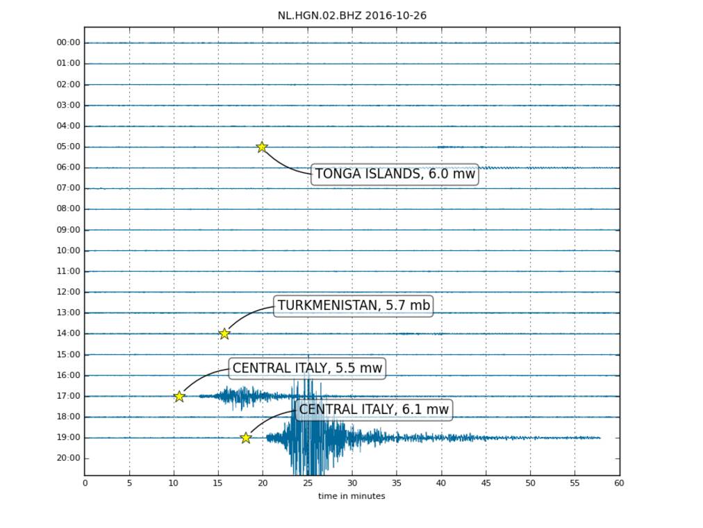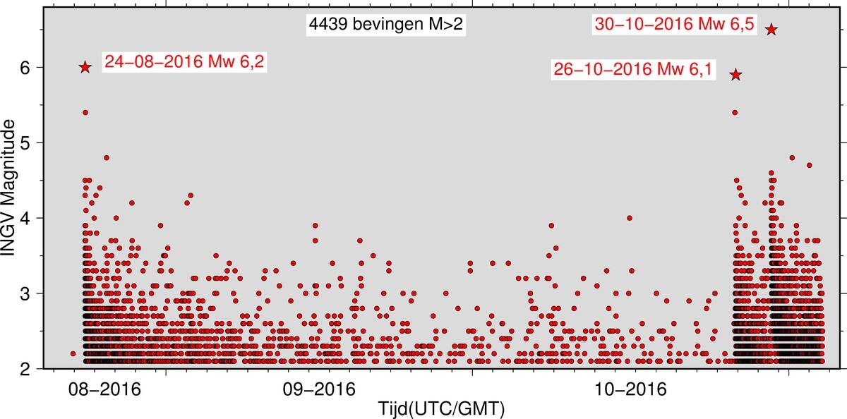 Door het KNMI zijn de bevingen ook in Nederland geregistreerd, zoals op bijgaand seismogram te zien. In totaal zijn er in de regio 4439 bevingen gemeten met een magnitude groter dan 2, tussen 24 augustus en 4 november. Elke rode stip in de grafiek (plaatje rechts) is een aardbeving. Hoe hoger de stip in de grafiek ligt, hoe groter de magnitude/kracht van de aardbeving was.