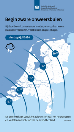 Vanaf eind van de middag in het zuidwesten en vanavond in de rest van het land is er kans op zware onweersbuien die van het zuidwesten naar het noordoosten over het land trekken. Bij deze buien kunnen zware windstoten voorkomen en plaatselijk veel regen, zware onweersbuien met bliksem en grote hagel.