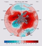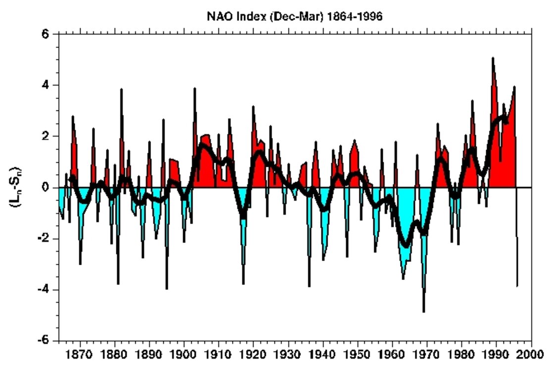 De drukverdeling boven de Noord Atlantische Oceaan wordt gekenmerkt door een dipool: het bekende lagedrukgebied bij IJsland en het Azorenhoog. De variatie in de sterkte van deze drukgebieden blijkt in fase te zijn en wordt de Noord Atlantische Oscillatie (NAO) genoemd. Als indexwordt vaak het drukverschil tussen IJsland (Stykkisholmur) ien de Azoren (of Lissabon) genomen. Als het "IJsland laag" minder diep is, is "Azoren hoog" vaak minder sterk. Dan is het drukverschil dus klein en is de NAO index laag. Als de drukgradiënt groot is, is de NAO index hoog.