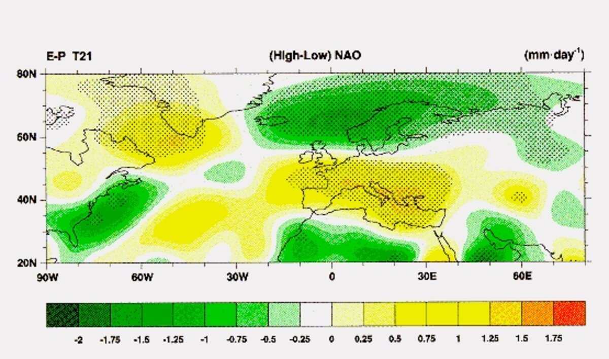 De invloed van de NAO op Europa is groot. Vooral in de wintermaanden is het weer in Europa goed gecorreleerd met de NAO. Simpel gezegd: als de NAO hoogis (sterke drukgradiënt), is er een sterke straalstroom en overheerst zacht weer in Nederland. Als de NAO laag is, is de kans op blokkades groter en kunnen we gaan schaatsen. Ook in de neerslag is er een goede correlatie met NAO. Dit heeft alles te maken met de stormtrack (zeg maar, de straalstroom).