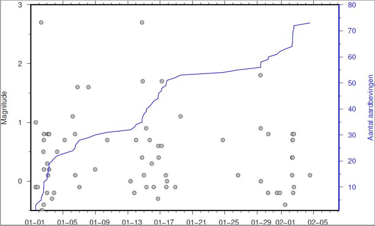 Een serie aardbevingen wordt een aardbevingszwerm genoemd, waarbij geen duidelijk voor-, hoofd- en naschok structuur zichtbaar is. De zwerm vindt plaats nabij het Duitse plaatsje Rott en bestaat nu uit 73 aardbevingen (figuur 2). De meest recent beving was op 4 februari jl. De magnitudes variëren tussen de -0,5 en 2,7. Negatieve magnitudes duiden op hele kleine aardbevingen die alleen instrumenteel meetbaar zijn. De grotere bevingen zijn in de regio goed gevoeld. In Nederland zijn de bevingen niet voelbaar, maar wel duidelijk te zien op seismometers in Limburg (figuur 3).