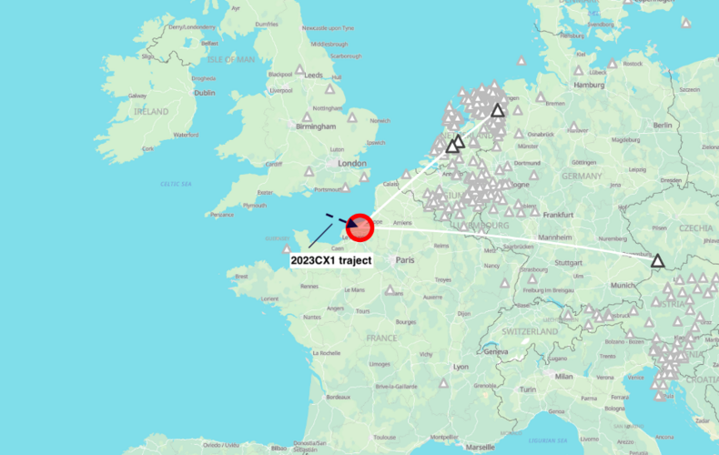 Kaart met de locatie van de inslag in Normandië, Frankrijk (rode bol) en een selectie van meetstations die infrageluid gemeten hebben (witte driehoeken). Het traject van de asteroïde is aangegeven met de zwarte pijl.